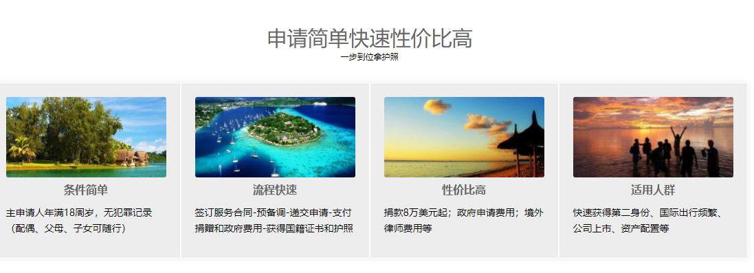 | 第三方费用(政府背景调查费、法律费用、行政费等) | 单人:5万美元; 夫妻+18岁以下孩子(2个以内):5.5万美元; * 每多加一个18岁以下孩子,多5000美元/人; * 每多加一个18岁以上未婚在读孩子,多1.5万美元/人; * 每增加一个50岁或以上父母,多1.5万美元/人; |