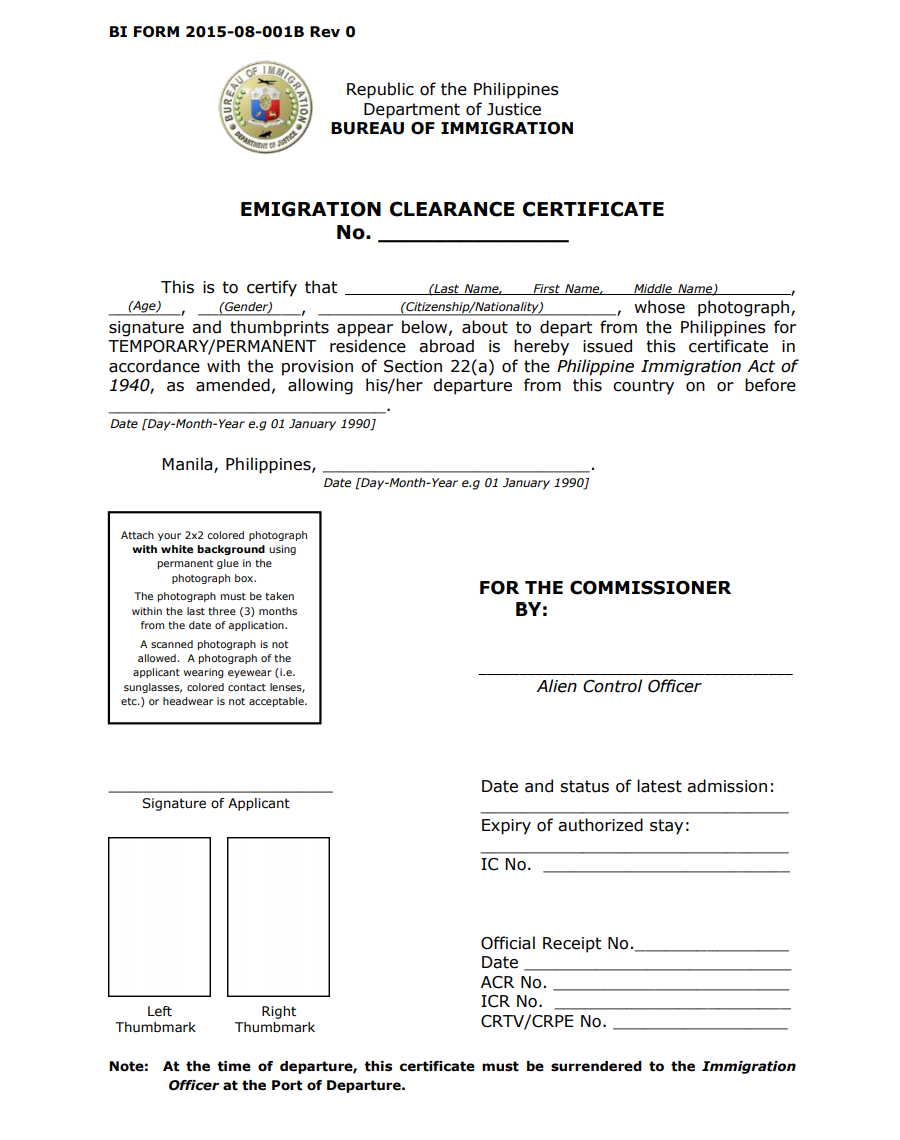 法律要求菲律宾的外国人在离开该国之前必须获得移民局 (BI) 颁发的移民清关证书 (ECC)。 它也称为出境许可,在出发前应要求提供,作为外国人在政府中没有未决义务或贬损记录的证明。