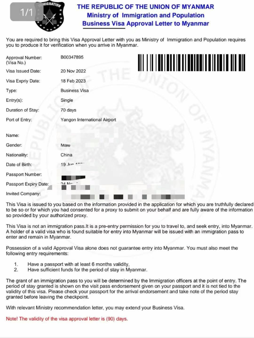 缅甸电子签+保险+邀请函+营业执照资料: