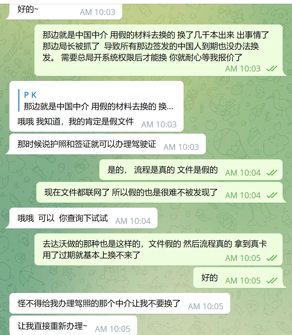 特殊情况需要提前和里面沟通。现在除了查驾驶证还查签证是否有效期,这也是正常的,按照他们的标准流程确实是有这个东西要求。温馨提醒大家 现在中介们有在重复这样的模式了 只是把办证地方换成 达沃。。。 是的坐飞机去一天拿证那种往返的 都是有问题的。不要喷我。实际就是这样的,流程是真的 材料是假的,如果你这周联系说要办理驾驶证然后没三天半个月就叫你去办理的 可以告诉你就是假的,中介做假的资料只需要几个小时 几天。。。。而真的材料需要一个月的等待认证周期,这个是逃不掉的,加急也就只能快5天左右,所以不要再被骗了,当然后面达沃的过期也会面临这个问题 换证难,如果愿意在花费几万比索的话还是可以换出来 只是我们也不知道意义何在? 如果真的出重大事故 想必 你假的底 在怎么样也兜不住。。。。有需要真驾驶证的联系我们欢迎咨询我们了解更多,微信BGC998 电报小飞机 @BGC998 优先咨询电报免验证直接咨询。 添加请主动告知咨询事宜 谢谢。或者你驾驶证到期 自己没办法换的可以联系我们尝试更换,有很多不能换的原因是 档案根本不是你的 套牌的驾驶证。。。。