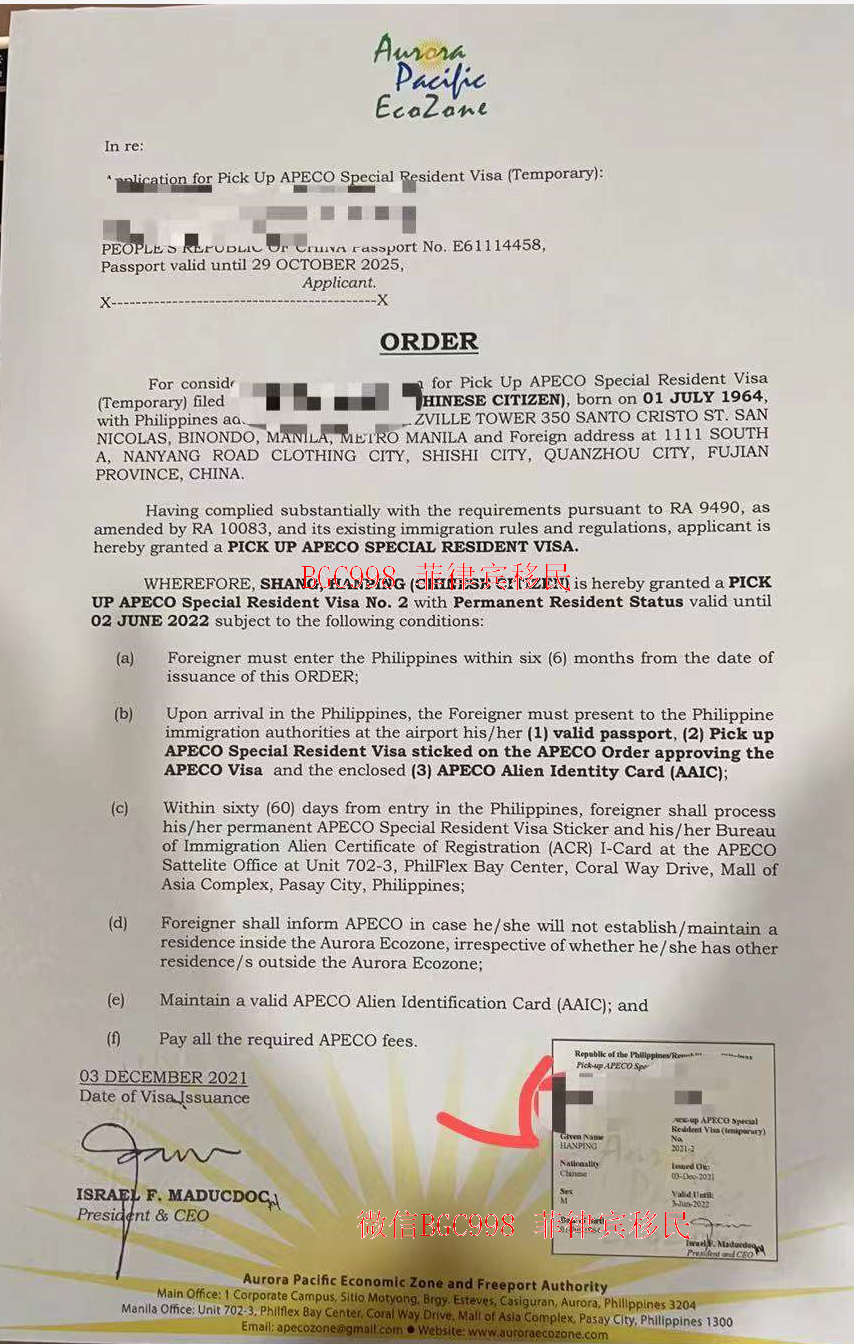 第三步:特区签证以及特区身份卡等材料会邮寄回国内给到客人手上,根据移民局法案要求申请人必须在6个月内入境前往菲律宾,办理后续签证变更永居签证。