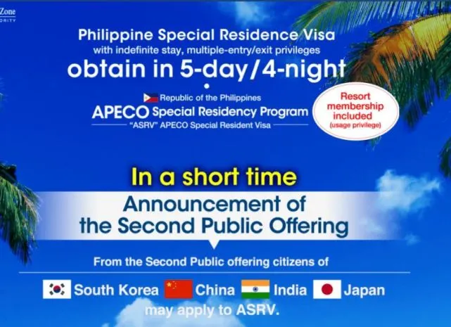 Part 1. 菲律宾ASRV小特赦菲律宾ASRV是一种特殊的永久居留签证,是成为 Aurora经济特区(APECO)的成员而获得的, 由菲律宾政府直属APECO经济区特批的永居签证, 获取方式是通过捐款获得永居身份,终生使用。