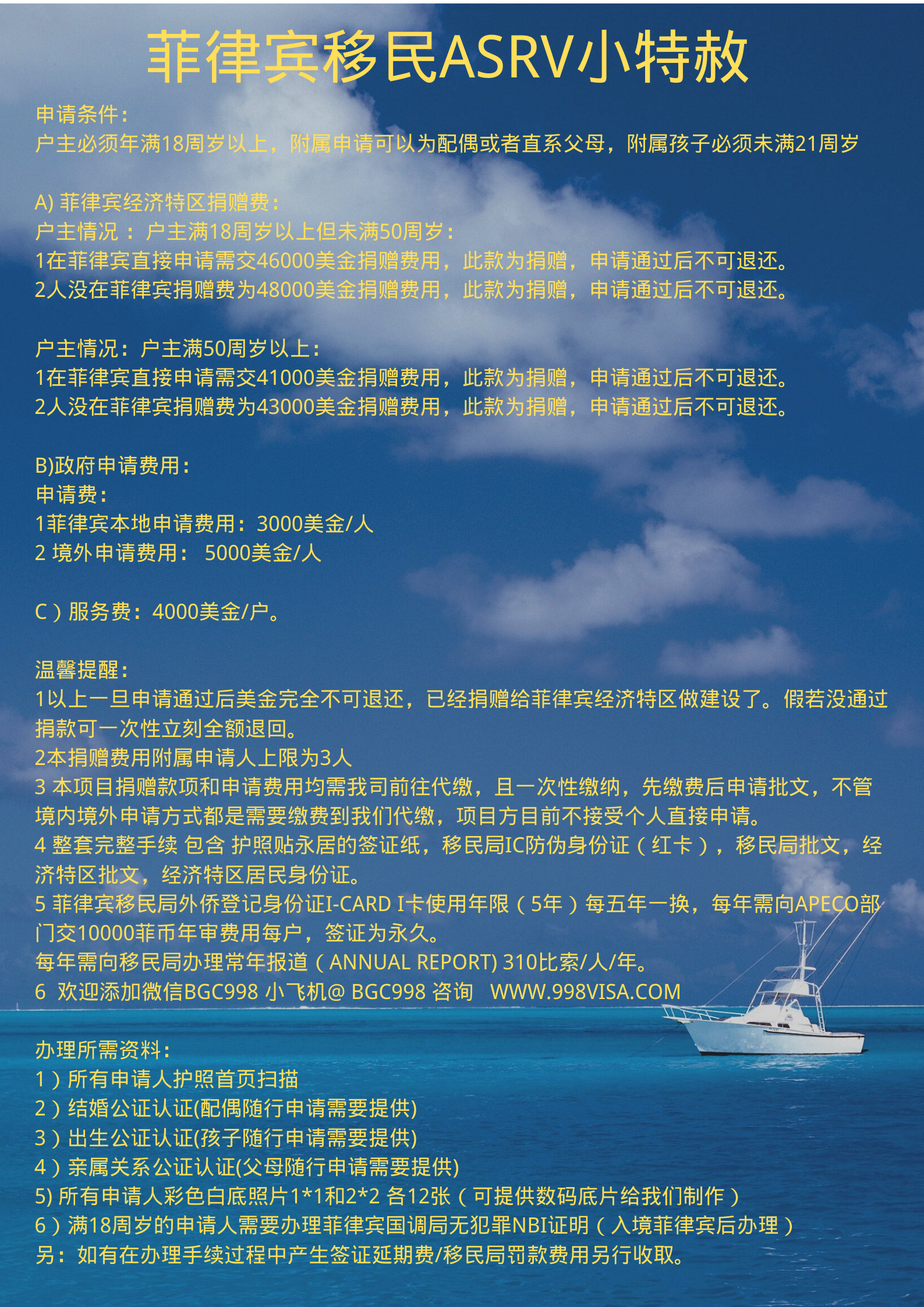 ASRV基础申请条件:菲律宾经济特区捐赠费:A)户主年龄情况户主情况 :户主满18周岁以上但未满50周岁:1、在菲律宾直接申请需交46000美金捐赠费用,此款为捐赠,申请通过后不可退还。2、人没在菲律宾捐赠费为48000美金捐赠费用,此款为捐赠,申请通过后不可退还。